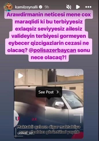 "Araşdırmanın nəticəsi mənə çox maraqlıdır ki, bu tərbiyəsiz, əxlaqsız, səviyyəsiz, ailəsiz, valideyn tərbiyəsi görməmiş, eybəcər qızcığazların cəzası nə olacaq? Bu məsələnin sonu necə olacaq?"