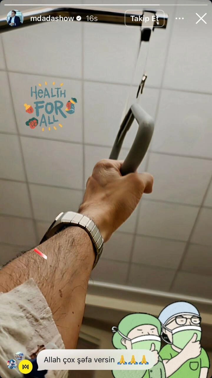 O, xəstəxana otağından çəkilmiş görüntüsünü izləyiciləri ilə bölüşüb. Paylaşımda Dadaşovun qolunda sistem olduğu diqqət çəkib.