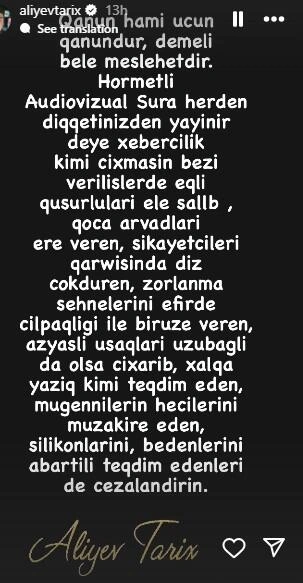 "Qanun hamı üçün qanundur, deməli, belə məsləhətdir. Hörmətli Audiovizual şura, deyəsən, hərdən diqqətinizdən yayınır, xəbərçilik kimi çıxmasın: Bəzi verilişlərdə əqli qüsurluları ələ salıb, qoca arvadları ərə verən, şikayətçiləri qarşısında diz çökdürən, zorlanma səhnələrini efirdə çılpaqlığı ilə büruzə verən, azyaşlı uşaqları üzübağlı da olsa çıxarıb xalqa yazıq kimi təqdim edən, müğənnilərin həcilərini müzakirə edən, silikonlarını, bədənlərini abartılı formada təqdim edənləri də cəzalandırın".