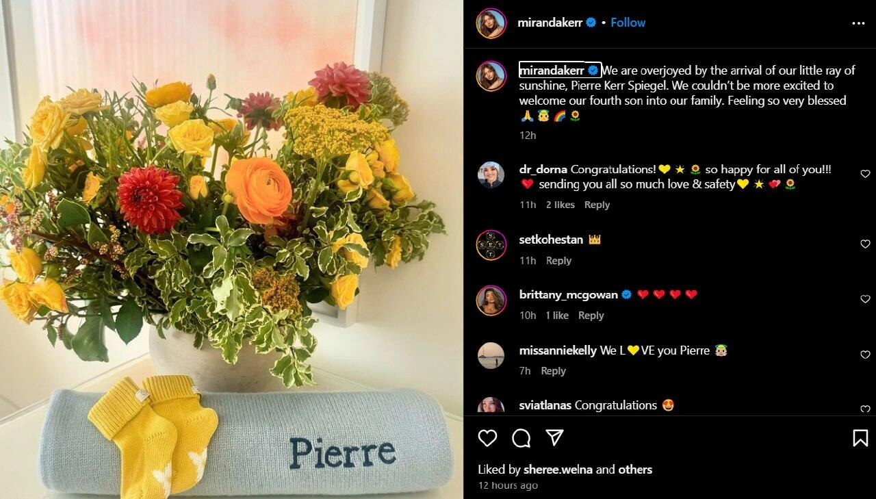 Podium ulduzu çiçək buketi, sarı uşaq çəkmələri və körpənin adı yazılmış mavi yorğan şəklini paylaşaraq "Kiçik günəş şüamız Pierre Kerr Spinelin doğulduğunu elan etməkdən çox şadıq. Xoşbəxtik!" sözlərini yazıb.