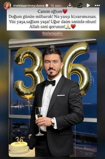 "Canım oğlum, doğum günün mübarək. Nə yaxşı ki, varımızsan. Yüz yaşa, sağlam yaşa. Uğur daim səninlə olsun. Allah səni qorusun" deyə, M.Eyubova paylaşımında yazıb.