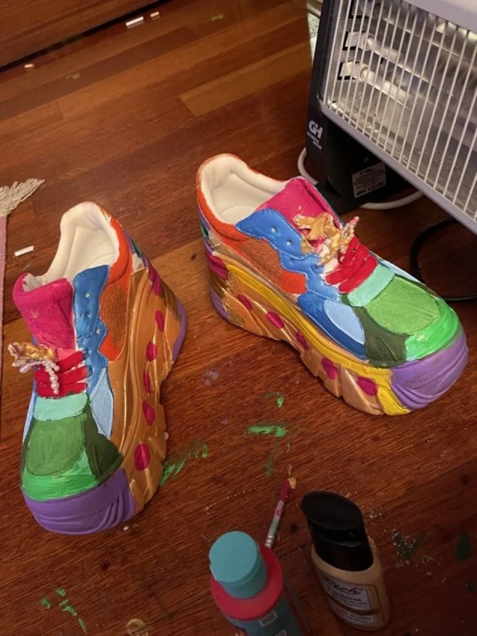 O, Belçikadan 1500 lirəyə (təxminən 80 manat) aldığı adi ağ idman ayaqqabısını boyayaraq konsertə çıxıb.