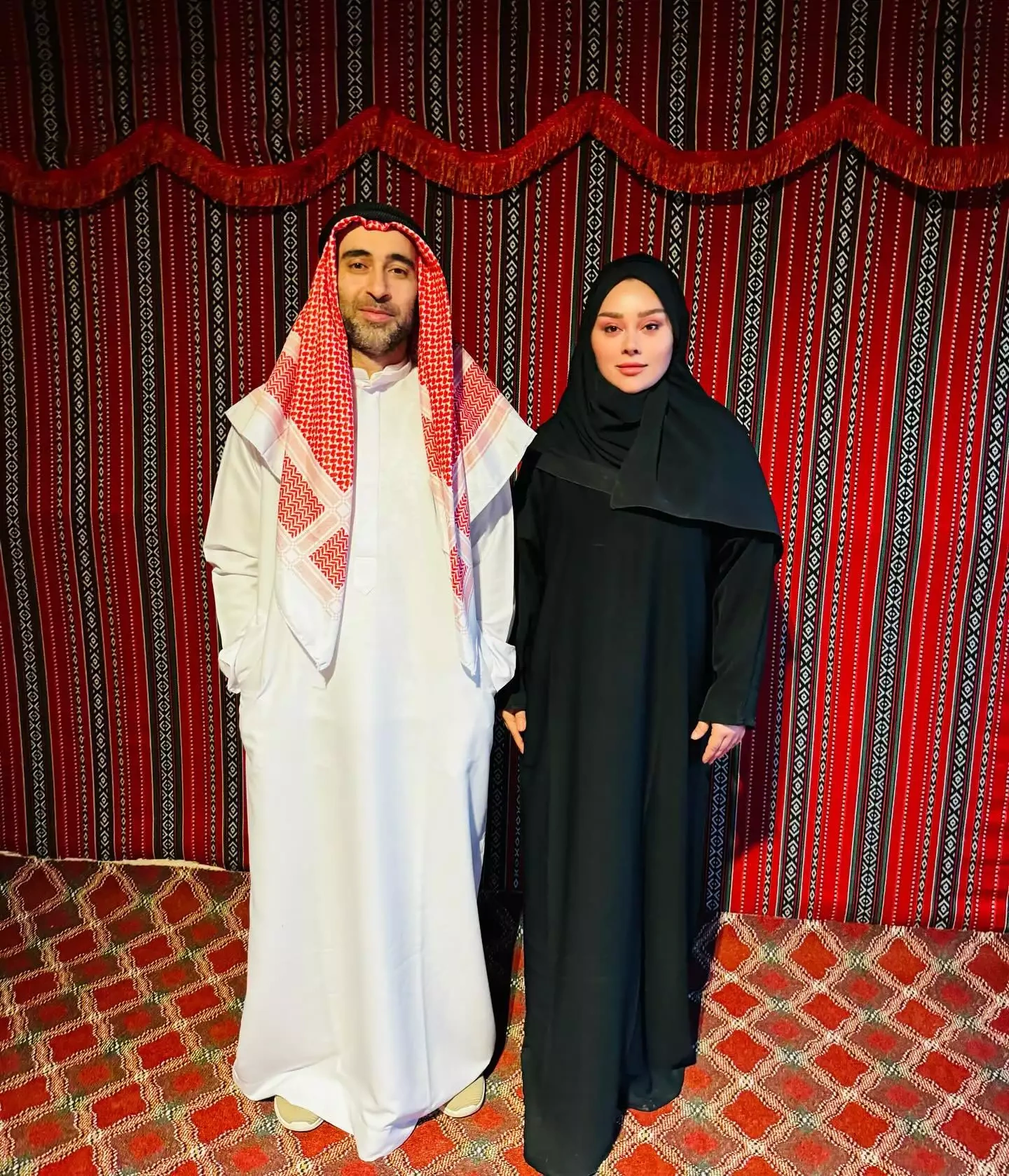 Xatirənin özü hicabda, əri isə ərəb milli geyimində kamera qarşısına keçib.