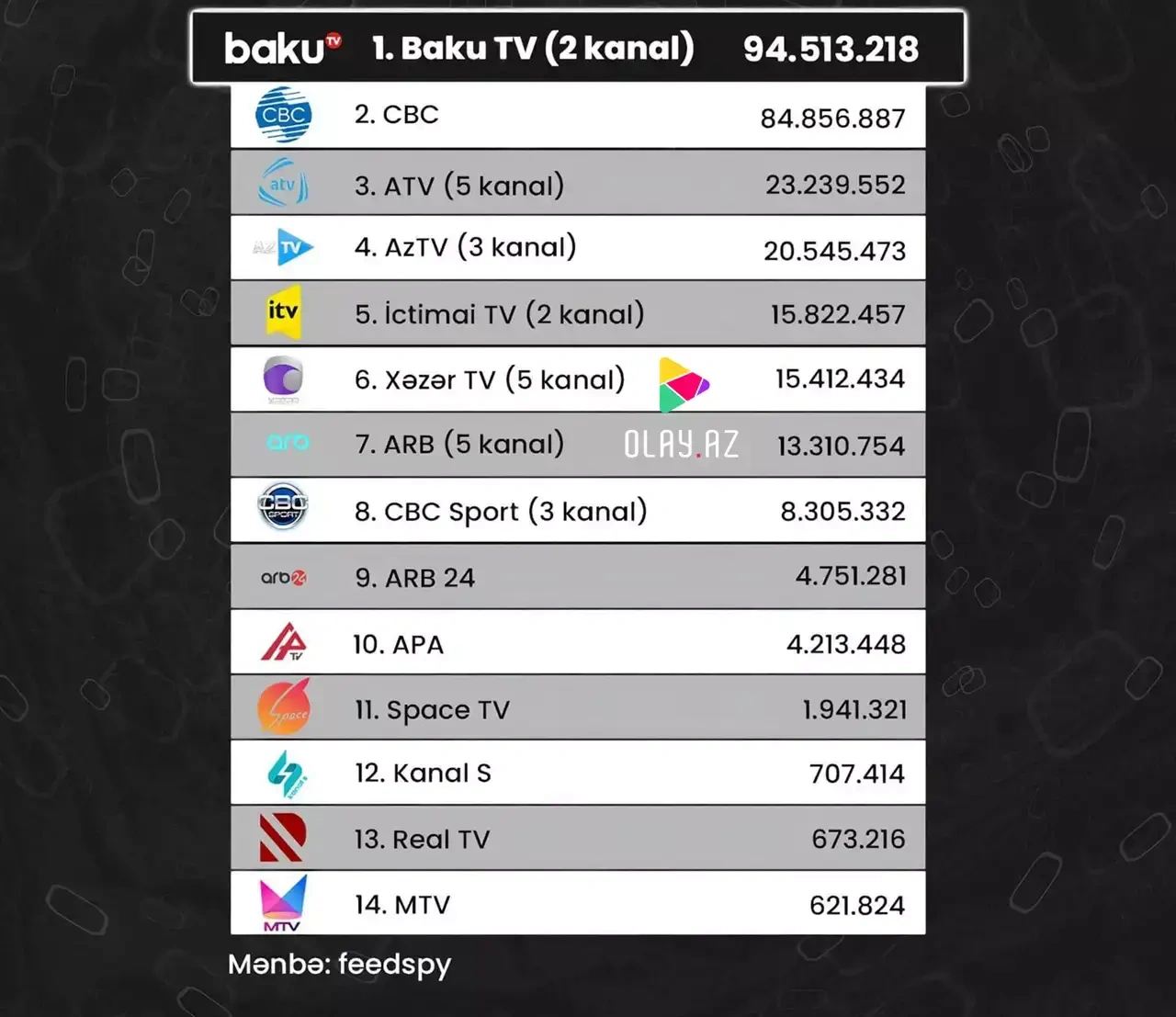 OLAY yazır ki, birinci yerin sahibi Baku TV olub.