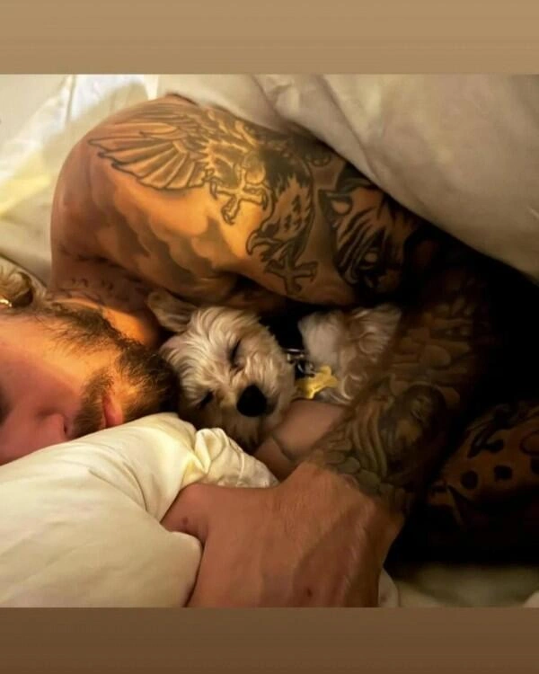 Yataq otağında çəkilən şəkildə cütlüyün itləri də yer alıb.