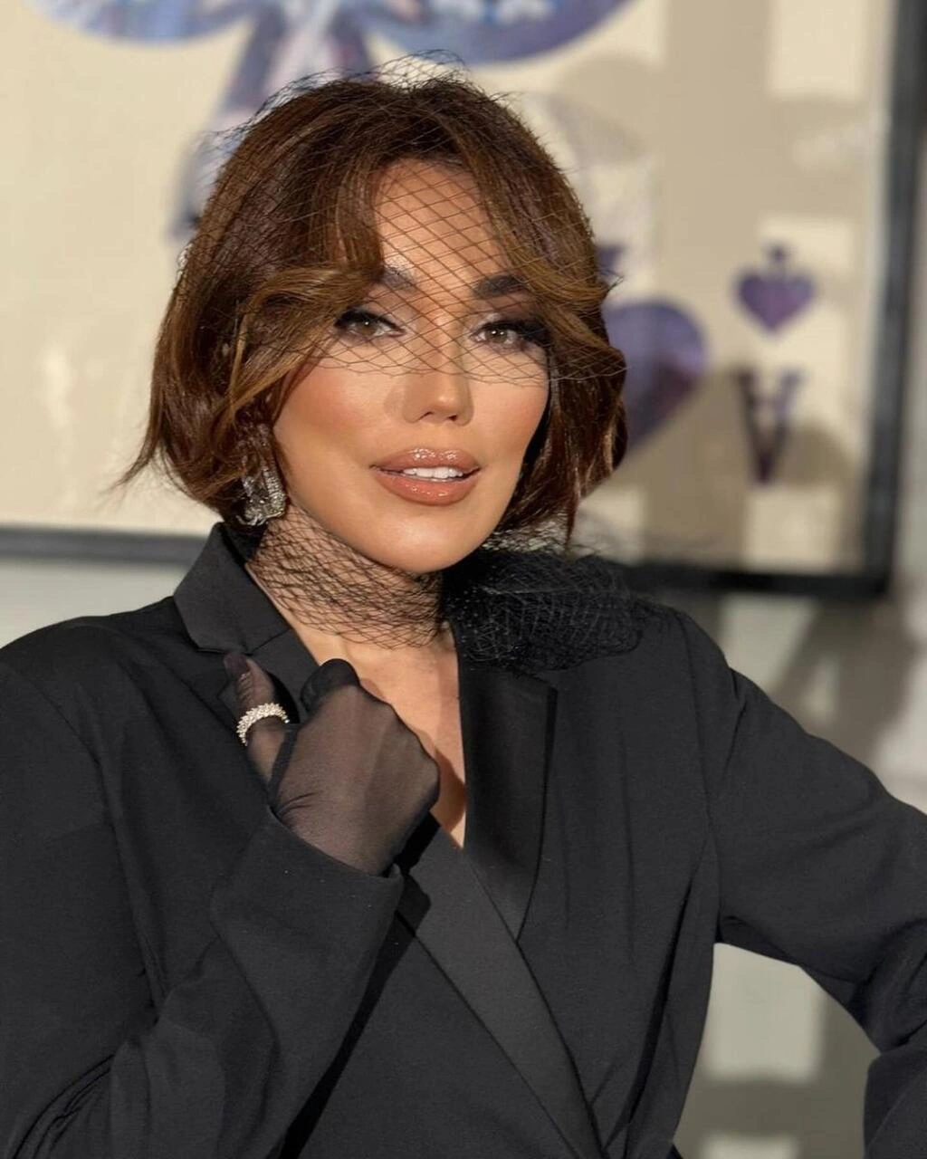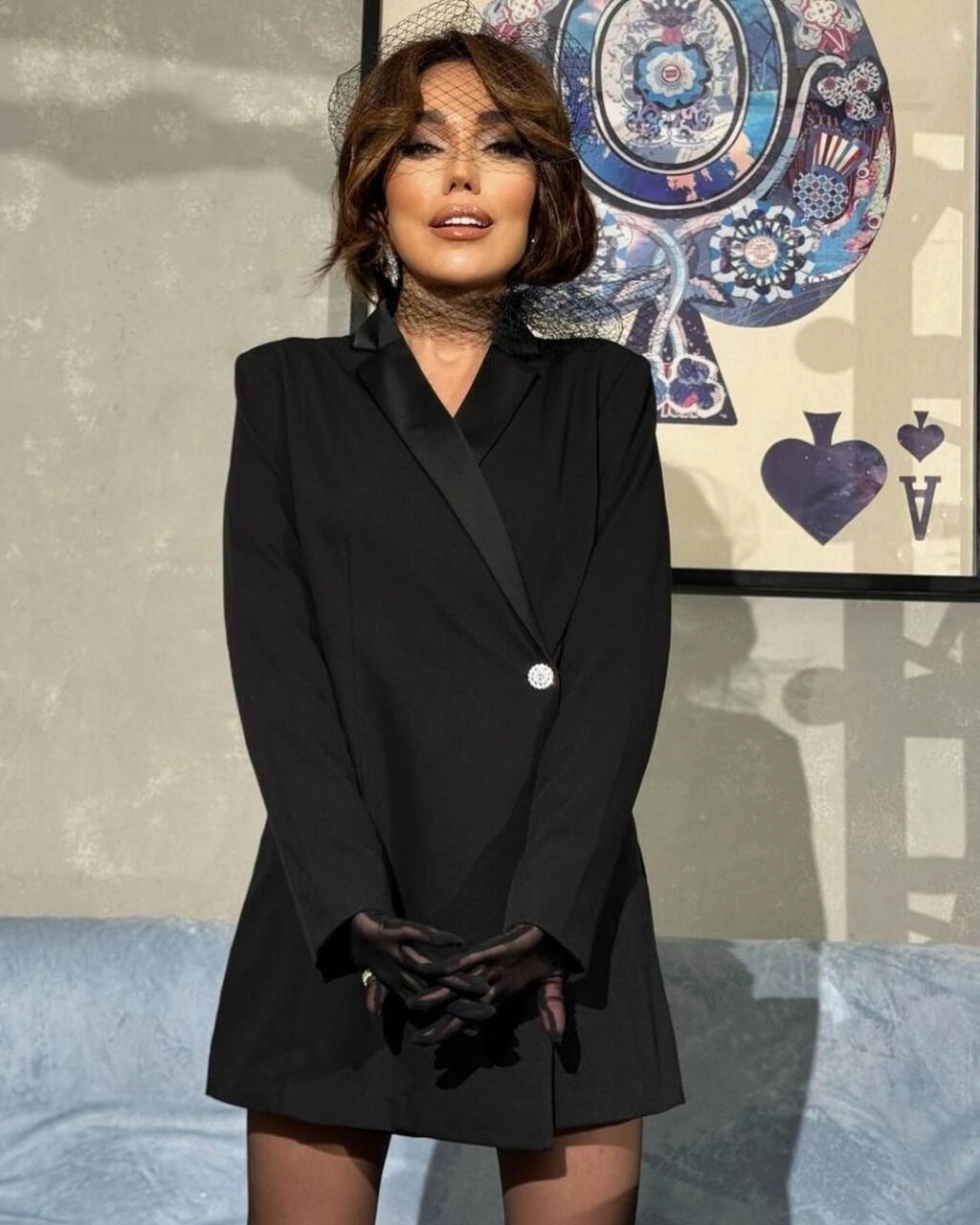 Qlamur tərzdə obyektiv qarşısına keçən Məmmədova əyninə qara yandan bir düymə ilə bağlanan uzun pencək geyinib. Obrazını tamamlamaq üçün o, eyni rəngdə şəffaf əlcək taxıb.