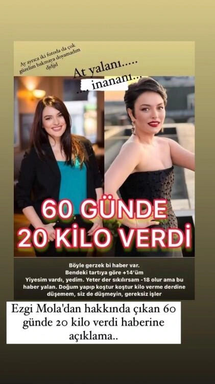 Türk medisanıda yeni ana olan aktrisa Ezgi Molanın 60 gündə 20 kiloqram çəki atdığı ilə bağlı xəbərlər yayılıb.
