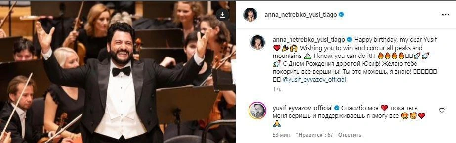 Milli.Az bildirir ki, axşam.az xəbər verir ki, sənətçinin həyat yoldaşı, Rusiyanın Xalq artisti Anna Netrebko sosial media hesabında onu bu münasibətlə təbrik edən paylaşım edib: