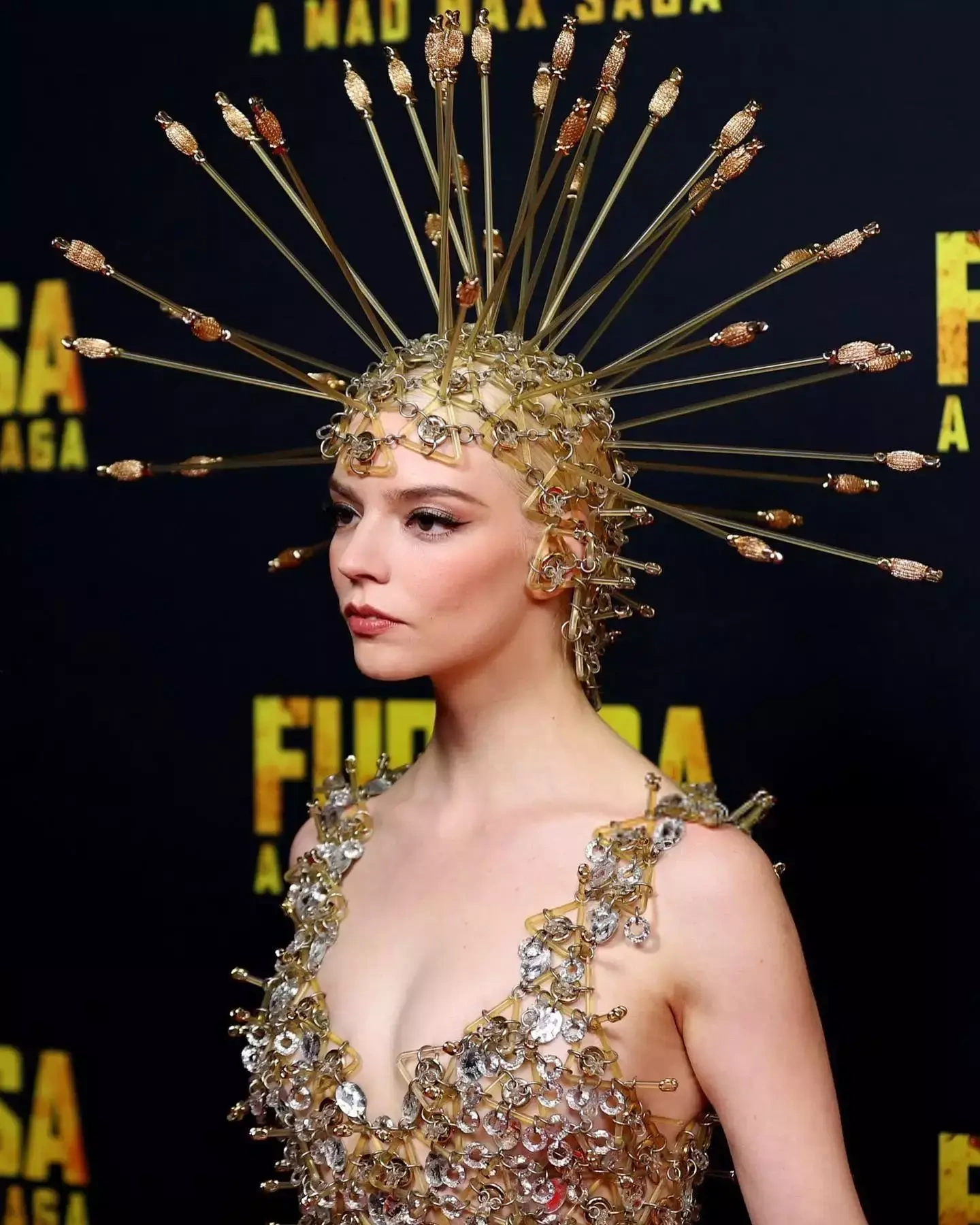 Anyanın başındakı aksesuardan tutmuş paltarın ən aşağı hissəsinə qədər dik dəmir detallar yer alıb.