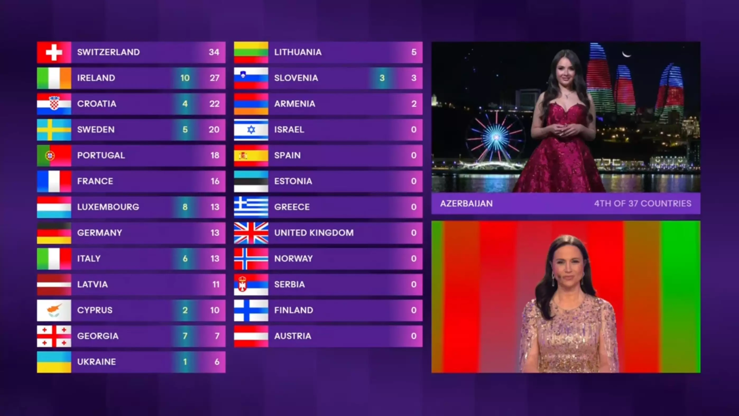 Ukraynaya bir, Kiprə iki, Sloveniyaya üç, Xorvatiyaya dörd, İsveçə beş, İtaliyaya altı, Gürcüstana yeddi, Lüksemburqa səkkiz, İrlandiyaya on xal verilib.