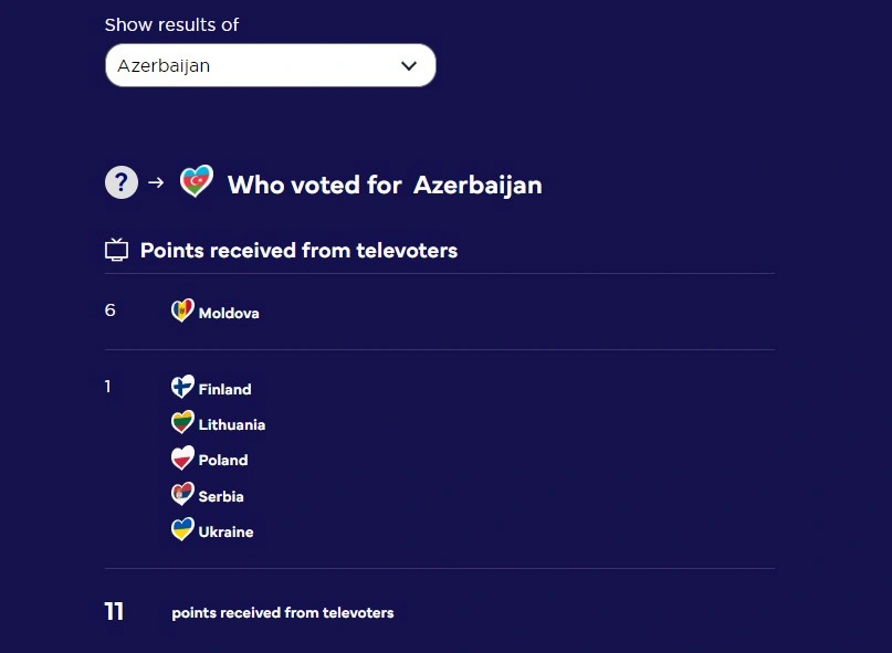 Ümumilikdə 6 ölkədən olan televiziya tamaşaçıları Azərbaycana 11 xal verib: