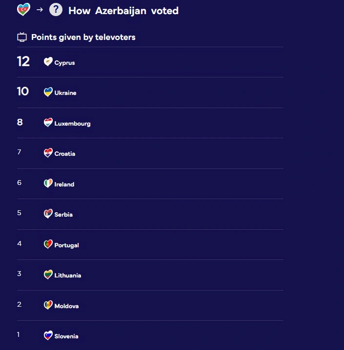 Öz növbəsində Azərbaycan televiziya tamaşaçıları səsvermədə ən yüksək 12 xalı Kiprə veriblər. Həmçinin, azərbaycanlı tamaşaçıların səsvermə nəticələrinə görə ilk 5-likdə Ukrayna (10 xal), Lüksemburq (8 xal), Xorvatiya (7 xal) və İrlandiya (6 xal) yer alıb.