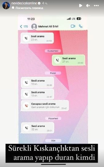 Nevide həmçinin Ərbillə yazışmalarını və birlikdə olduqlarını sübut edən görüntüləri də sosial media hesabında izləyiciləri ilə bölüşüb.