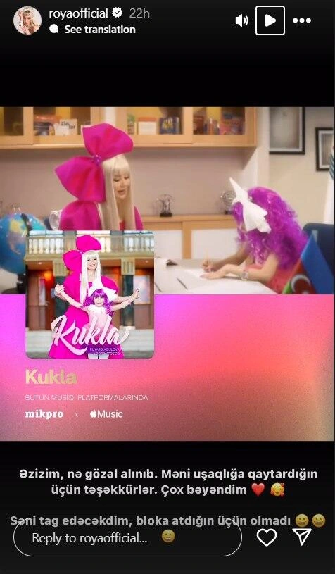 "Əzizim, nə gözəl alınıb. Məni uşaqlığıma qaytardığın üçün təşəkkürlər. Çox bəyəndim. Səni "tag" (işarələmək - red.) edəcəkdim, "bloka" (qara siyahı - red.) atdığın üçün olmadı".
