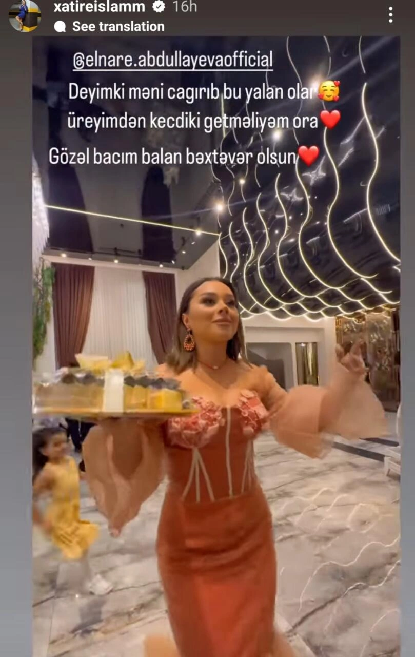 Milli.Az teleqraf.com-a istinadən bildirir ki, Xatirə İslam bu haqda İnstaqramda hekayə bölümündə məlumat verib: "Deyim ki, məni çağırıb, bu yalan olar. Ürəyimdən keçdi ki, ora getməliyəm. Gözəl bacım, balan bəxtəvər olsun".