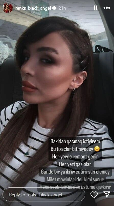 Renka ləqəbi ilə şou-biznesdə məşhurlaşan ərəb rəqslərinin mahir ifaçısı Rəna Ağamuradova paytaxtdakı tıxaclardan və yollarda aparılan təmir işlərindən şikayətlənib.
