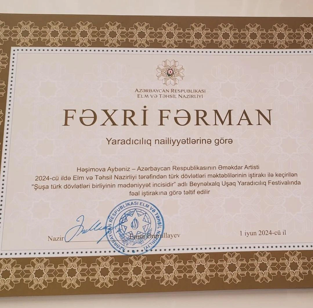Elm və Təhsil Naziri Emin Əmrullayev Əməkdar artist Aybəniz Haşımovanı Fəxri Fərmanla təltif edib.