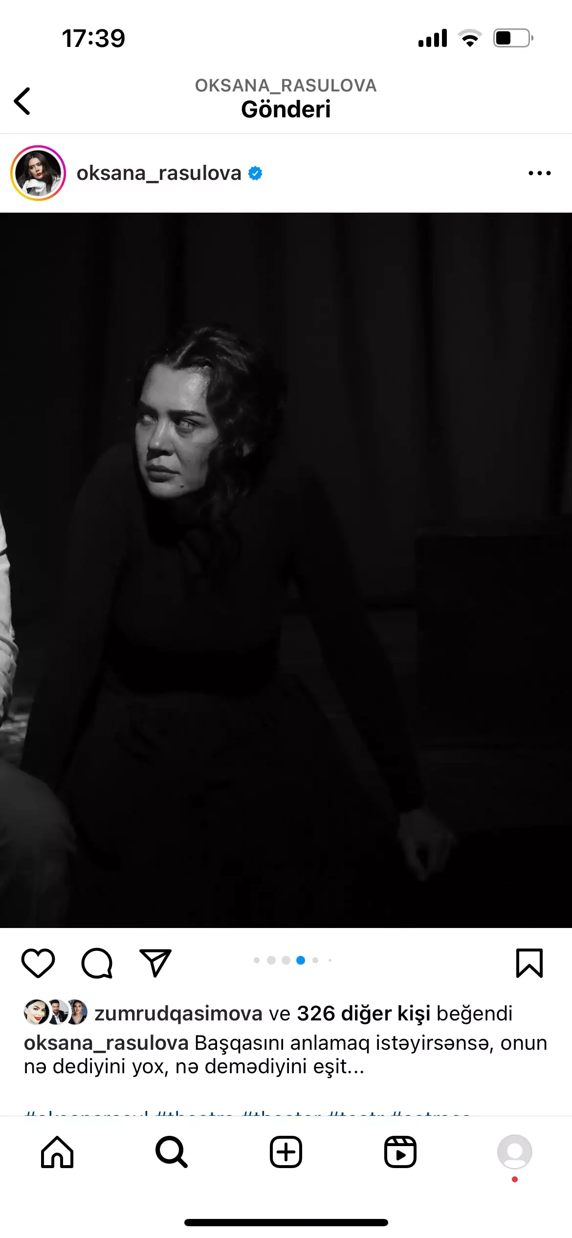 Əsas Şou biznes “Başqasını anlamaq istəyirsənsə…” “Başqasını anlamaq istəyirsənsə…” Gülay — 11 Dec 2023 17:40 “Başqasını anlamaq istəyirsənsə…” Aktrisa Oksana Rəsulova növbəti teatr tamaşasından paylaşım edib.OLAY yazır ki, səhnədən fotolarını paylaşan Oksana bu sözləri yazıb:“Başqasını anlamaq istəyirsənsə, onun nə dediyini yox, nə demədiyini eşit”.