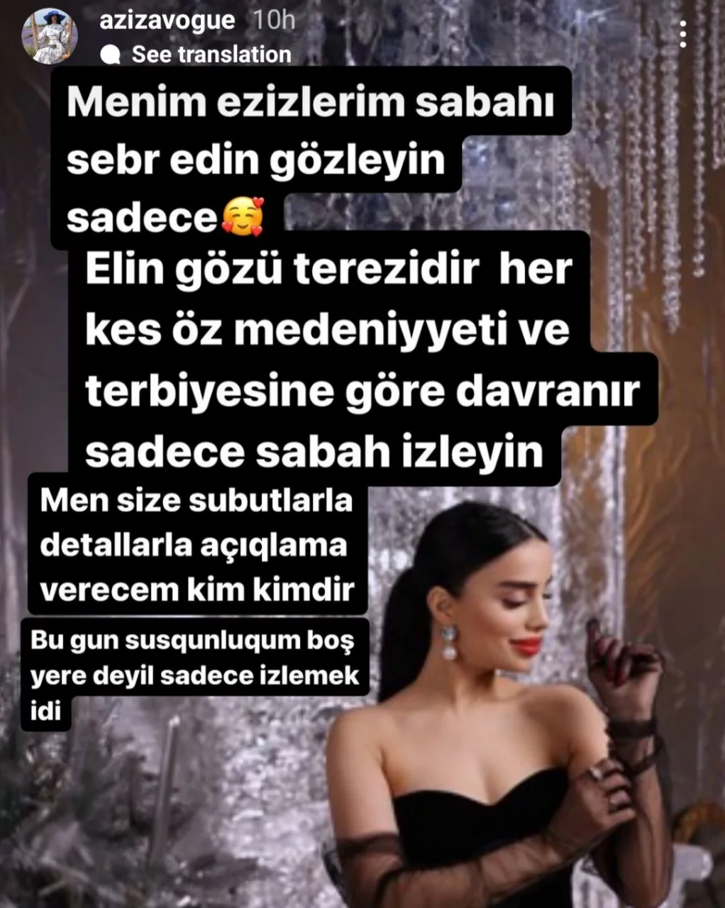Belə ki, Əzizə Novruzova İnstaqramda hekayə bölümündə bu sözləri yazıb: "Elin gözü tərzidir. Hər kəs öz mədəniyyət və tərbiyəsinə görə davranır. Mən sizə sübut, detallarla açıqlama verəcəm ki, kim kimdir. Bu gün susqunluğum boş yerə deyil, sadəcə izləmək idi. Mən heç vaxt baş qoşmamışam, yola vermişəm ki, ayıbdır. Səviyyəmi itirməyim, sakit durub kənardan izləyib gülmüşəm. Çünki ən gözəl cavab susmaqdır. Amma indi az da olsa açıqlama verməliyəm, çünki dil uzatdılar. O insan dil uzadar ki, özü, qızı ağ kağız olsun. Bunu sizə sosial şəbəkədə canlıda sübutla danışacam".