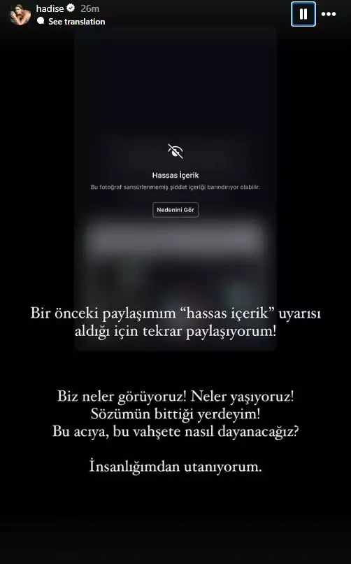 “Biz nələr görürük. Nələr yaşıyırıq? Sözümün bitdiyi yerdəyəm. Bu acıya və vəhşiliyə necə dayanacağıq? İnsanlığımdan utanıram!”, - deyə Hadise yazıb.