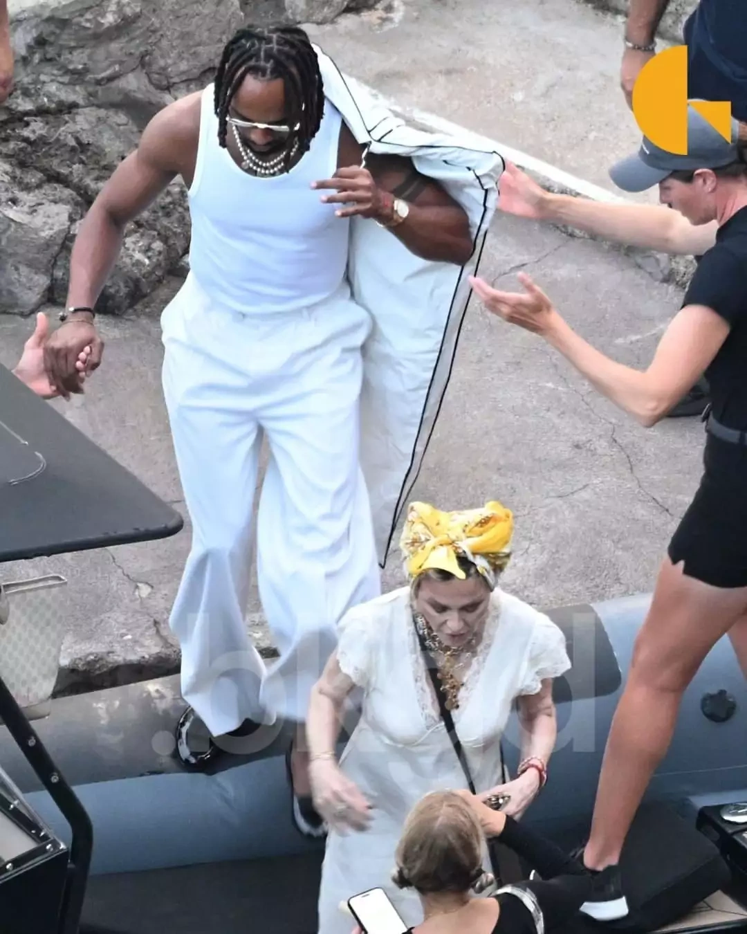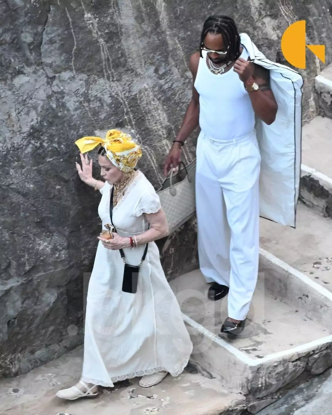 Fotolarda Akimin qolundan tutan Madonna pilləkanlardan enməsi əks olunub. Aşiqlər onları digər məkana aparacaq qayığa doğru addımlayıblar.