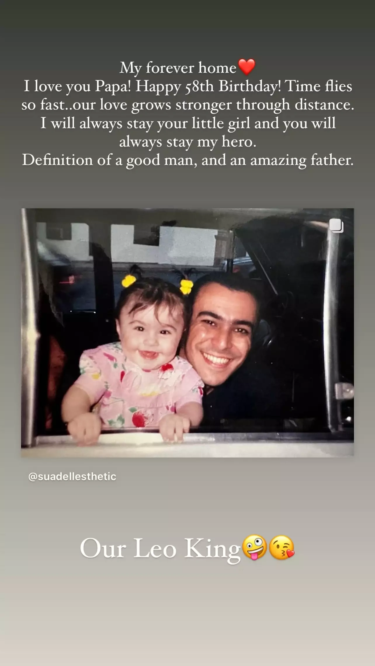 “Mənim əbədi evim. Səni sevirəm ata. 58 yaşınız mübarək. Zaman çox sürətlə keçir..sevgimiz məsafədən güclənir. Mən həmişə sənin kiçik qızın qalacağam və sən həmişə mənim qəhrəmanım olaraq qalacaqsan. Yaxşı insan və heyrətamiz ata. Bizim aslan kralımız”.