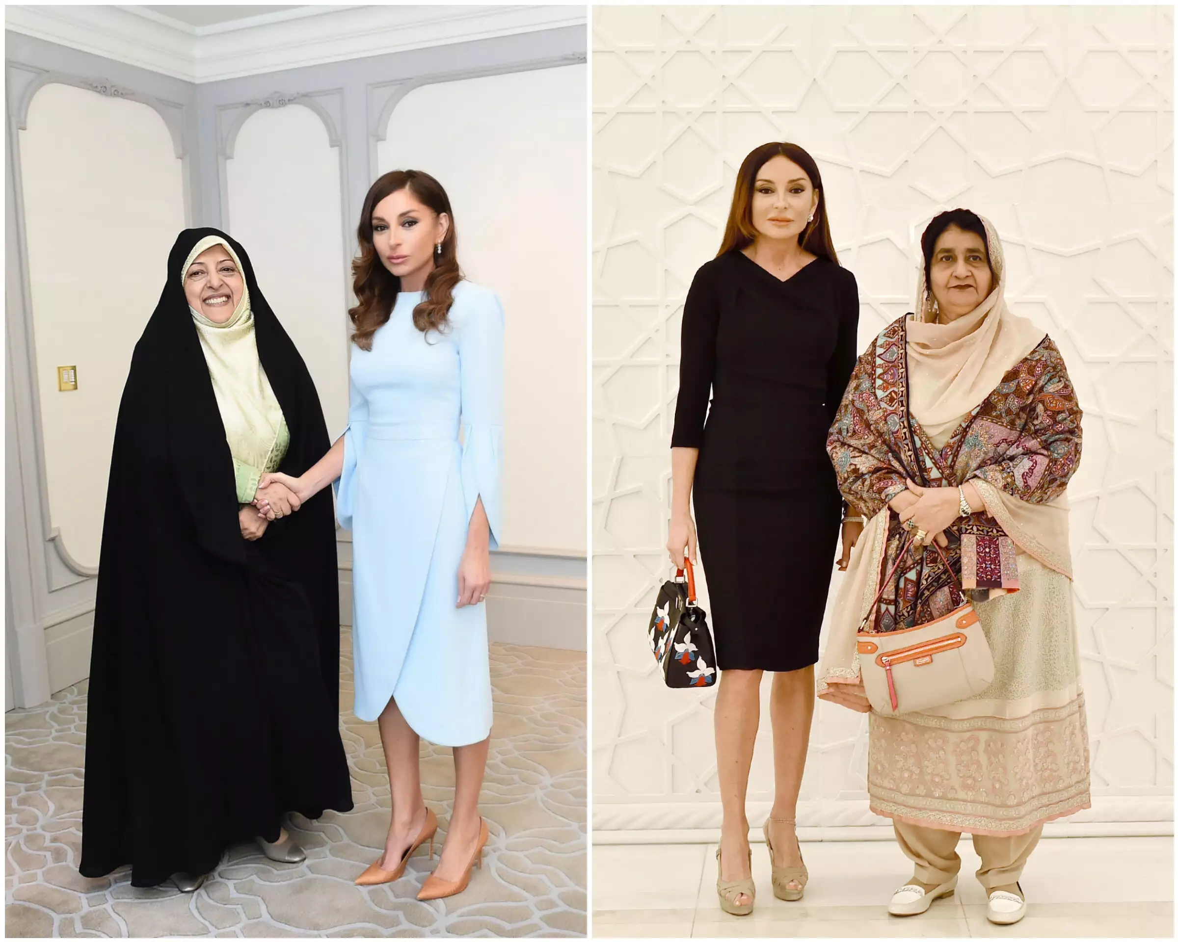 Azərbaycan Prezidentinin xanımı Avropa modasına maraq göstərir və geyimlərini ləyaqətlə daşıyır, amma baş örtüklərini də unutmur...