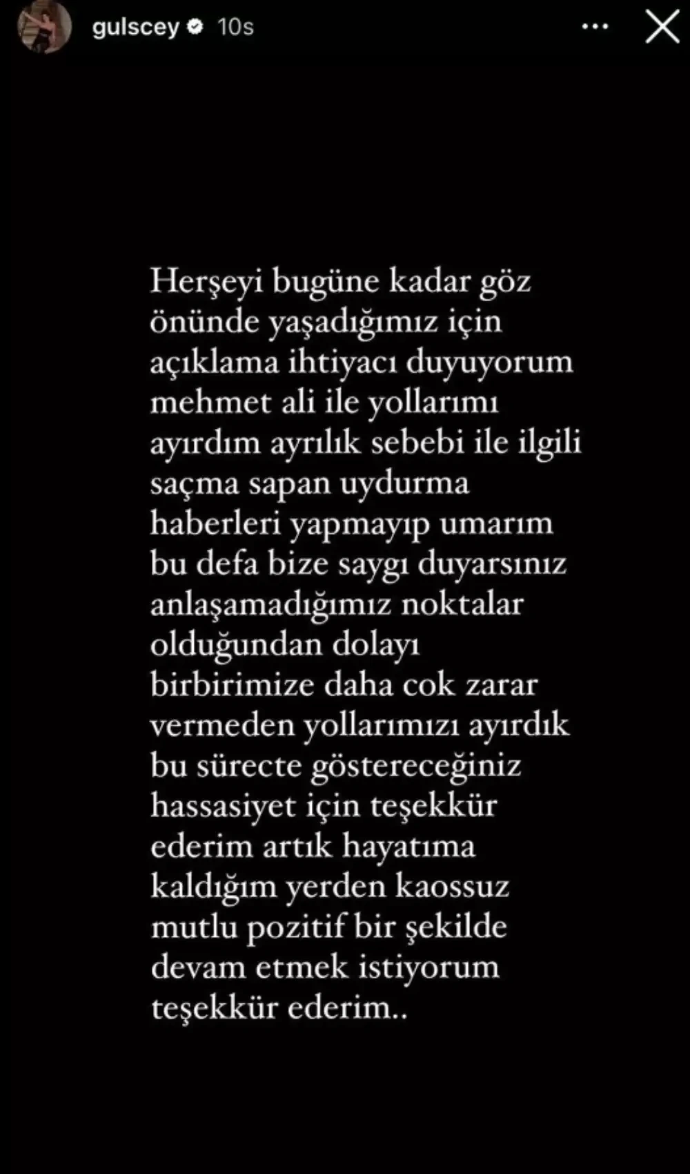 “Bu günə qədər yaşadığımız hər şeyi açıq şəkildə izah etməyə ehtiyac duyuram. Mehmet Ali ilə yolları ayırdım. Ümid edirəm ki, bu dəfə ayrılığın səbəbi ilə bağlı gülünc saxta xəbərlər verməyərək bizə hörmət edəcəksiniz. Bizim aramızda olan məqamlar var idi, razılaşa bilmədik, bir-birimizə daha çox zərər vermədən yollarımızı ayırdıq. Bu məsələdə həssaslığınız üçün təşəkkür edirəm. Həyatımı qaldığım yerdən, xaossuz, xoşbəxt və pozitiv şəkildə davam etdirmək istəyirəm, təşəkkür edirəm”.