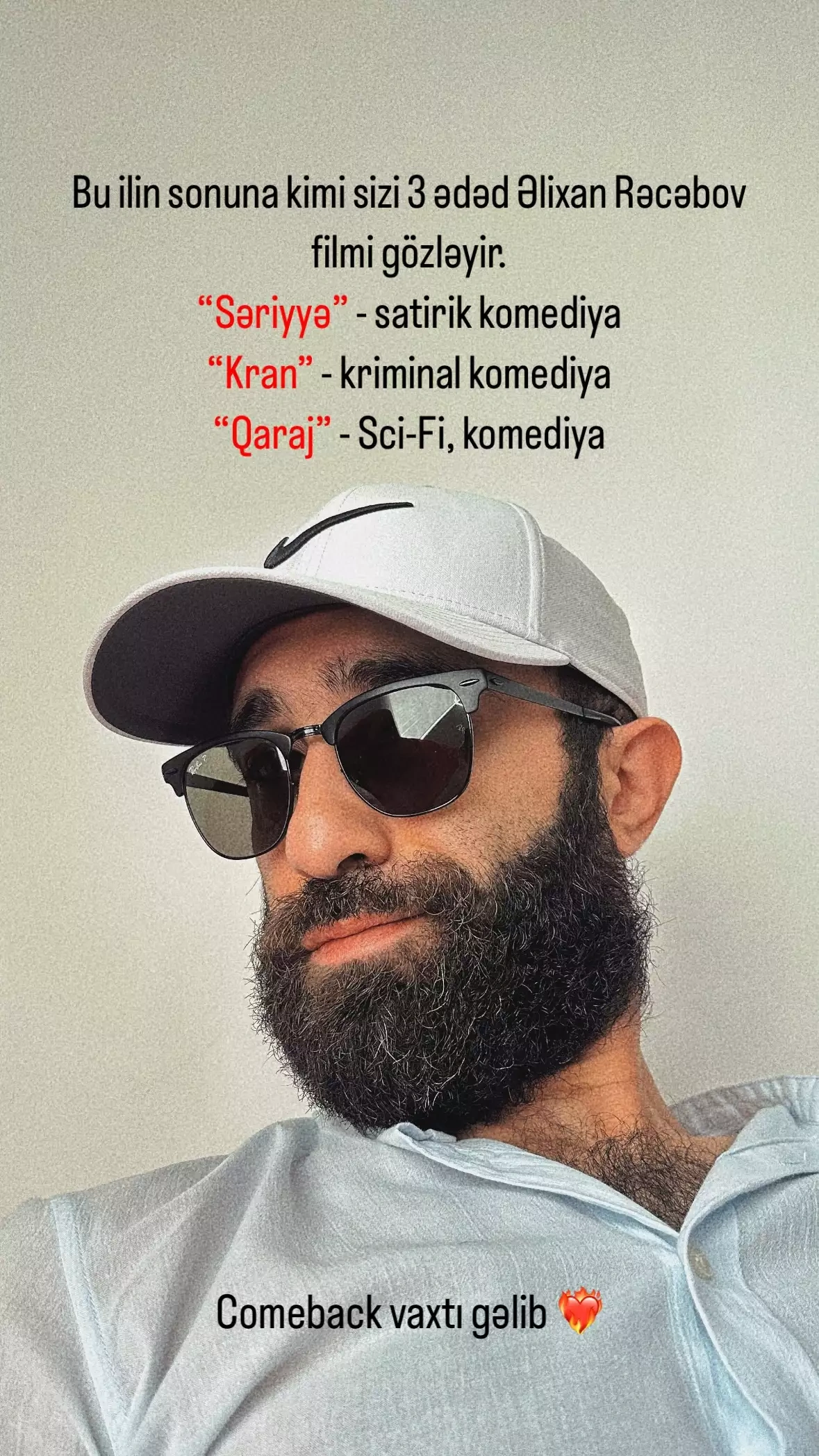 “Bu ilin sonuna kimi sizi Əlixan Rəcəbovun 3 yeni filmi gözləyir – “Səriyyə” (satiric komediya), “Kran” (kriminal komediya), “Qaraj” (Sci-Fi, komediya)”.