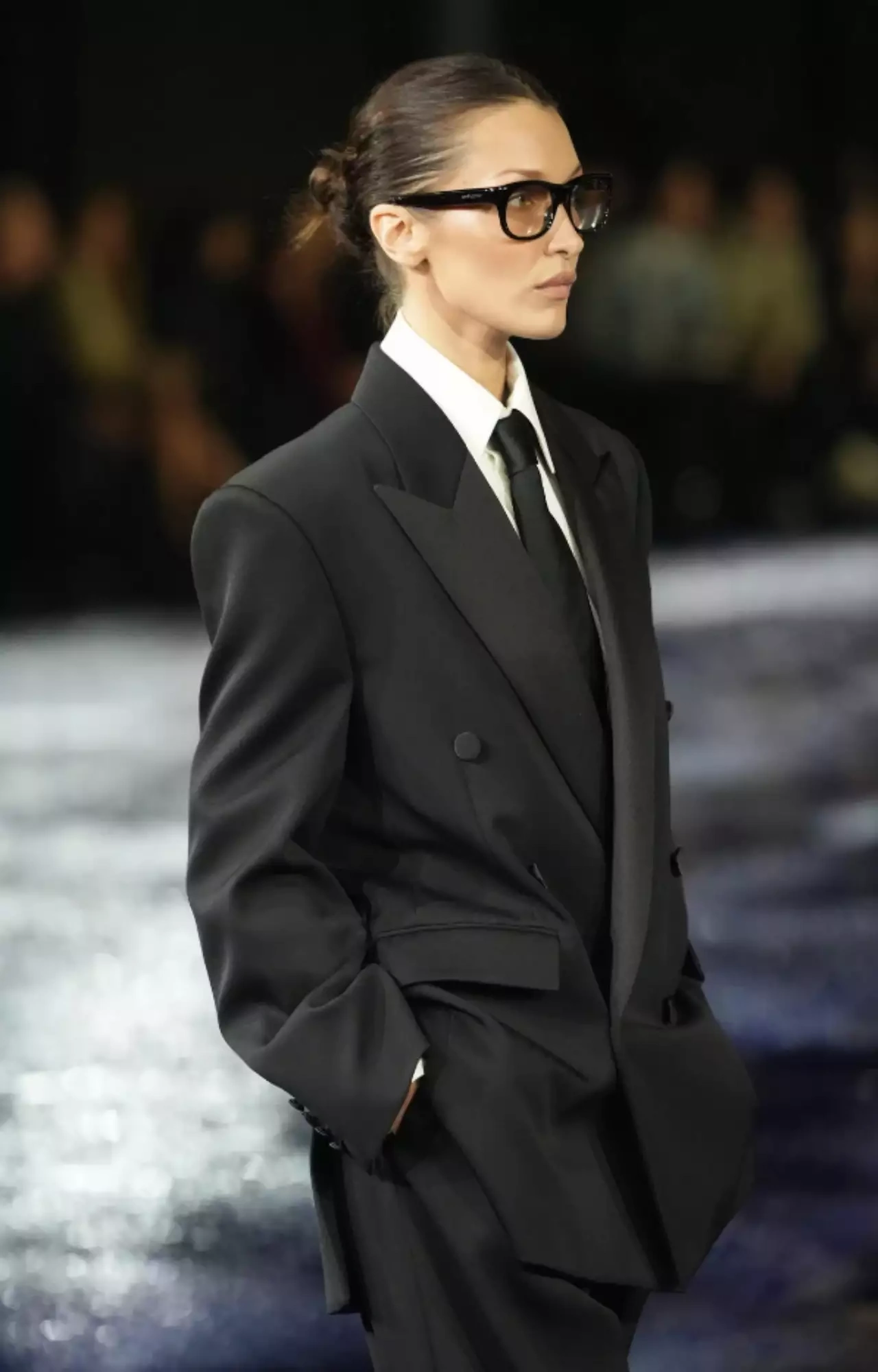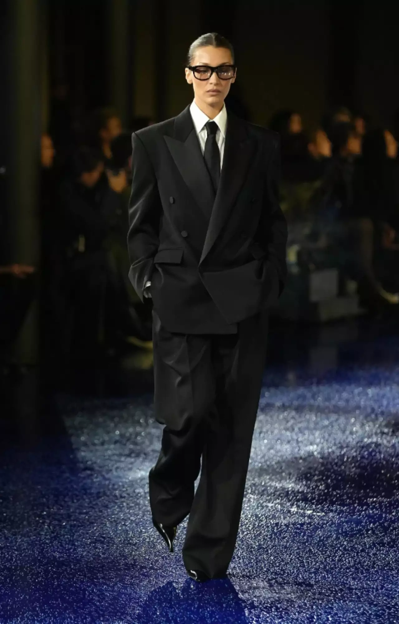 Model kişi kostyumunu xatırladan geyim geyinib. Bella podiumda gözəl qaməti və şıq duruşu ilə görənləri özünə heyran qoyub.
