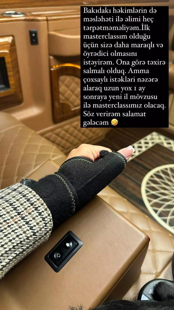 "Bakıdakı həkimlərin də məsləhəti ilə əlimi heç tərpətməməliyəm. Etməli olduğum masterklassı təxirə salıram. Amma çox yox cəmi 1 aydan sonra yeni il mövzusu ilə masterklassım olacaq. Söz verirəm salamat gələcəyəm".