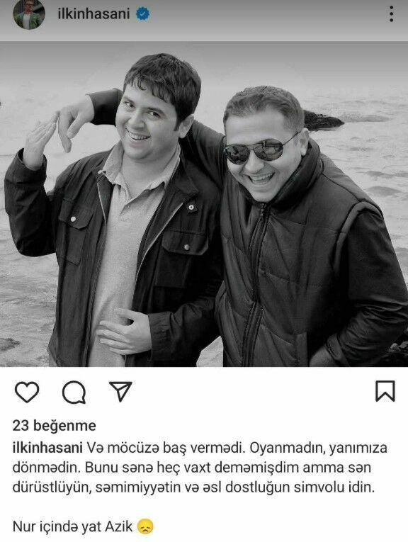 Aparıcı İlkin Həsəni aktyor Azər Baxşəliyevin vəfatı ilə bağlı sosial şəbəkədə paylaşım edib.