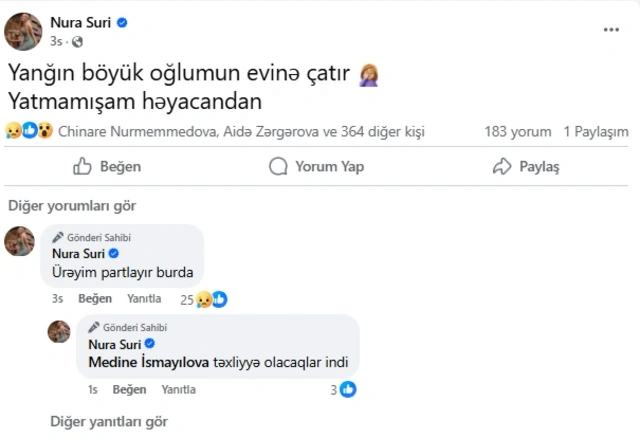 Milli.Az xəbər verir ki, bu barədə müğənni Nura Suri "Facebook" hesabında paylaşım edib.