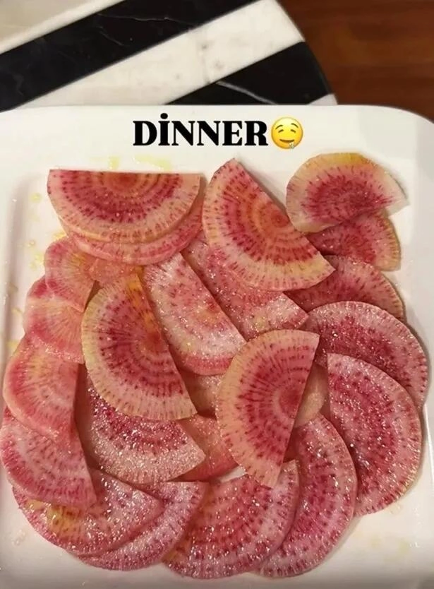 Milli.Az xəbər verir ki, o şam yeməyi üçün cəmi bir neçə dilim turp yediyini bildiirib. Bunun fotosunu çəkərək instaqram izləyiciləri ilə bölüşüb.