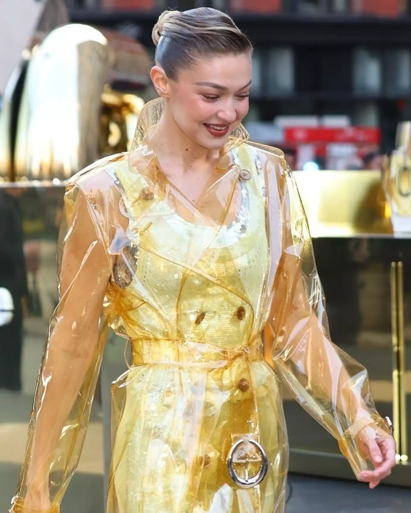 Ayaqqabı olaraq qızılı dabanlı çəkmələr seçən Hadid aksessuarlara minimal yanaşmış, daha təbii bir makiyaj və qızılı-qırmızı dodaq boyası ilə gecəyə xüsusi parıltı qatıb. Saçlarını isə dalğalı və “wet-look” (islanmış effekt) tərzində arxaya yığıb.