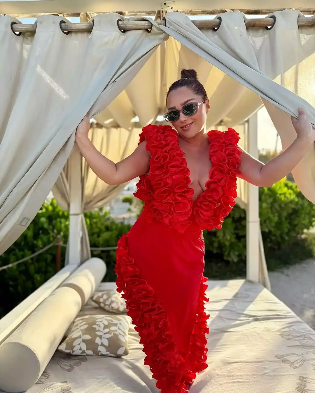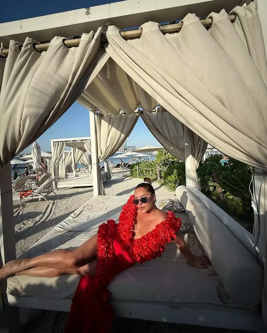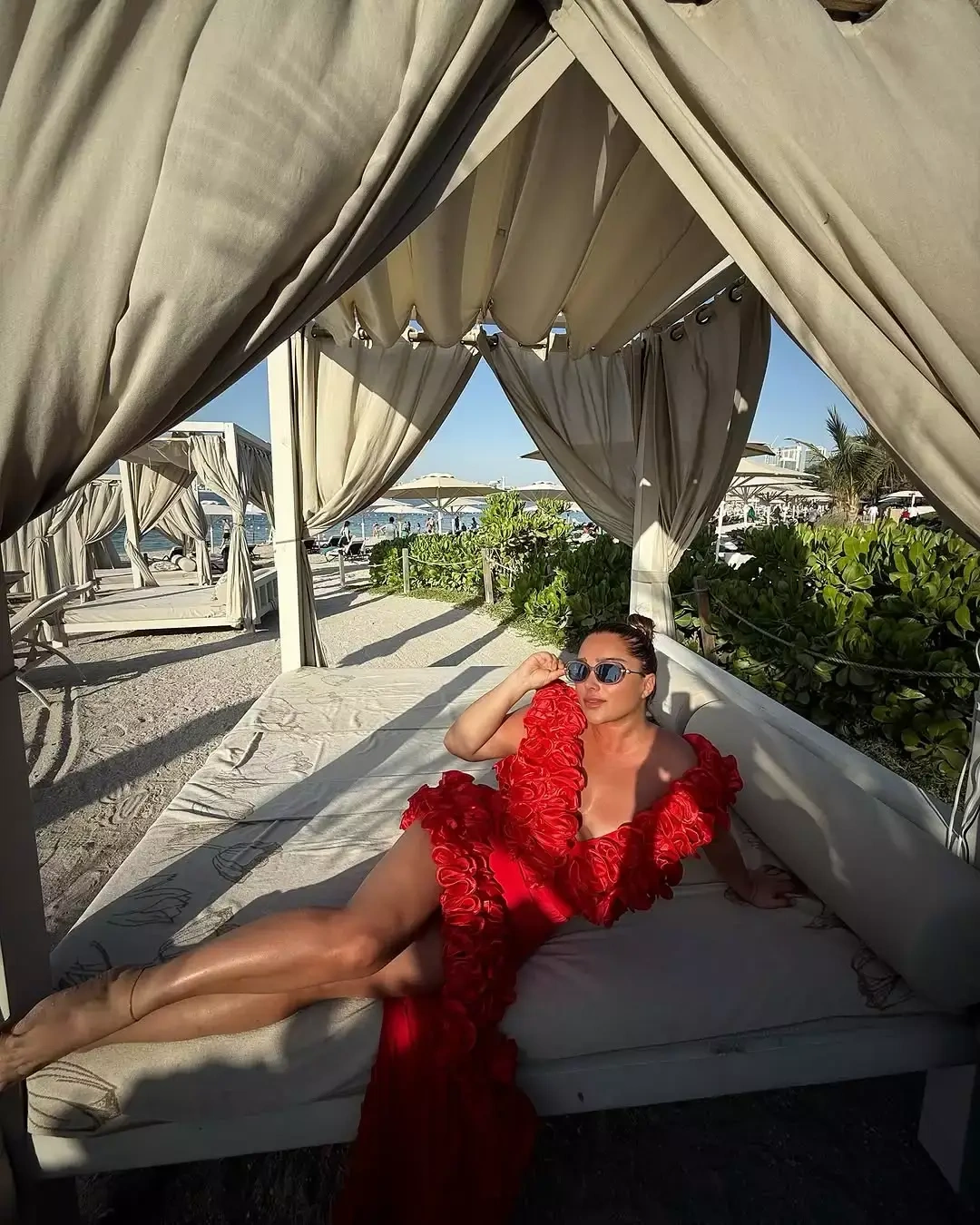 OLAY yazır ki, çimərlikdə istirahətin dadını çıxaran sənətçi qırmızı rəngli yan hissələri açıq, sinə dekolteli libasda obyektiv qarşısına keçib.