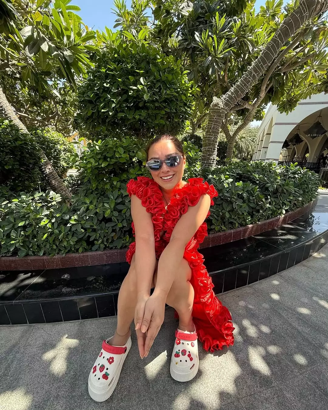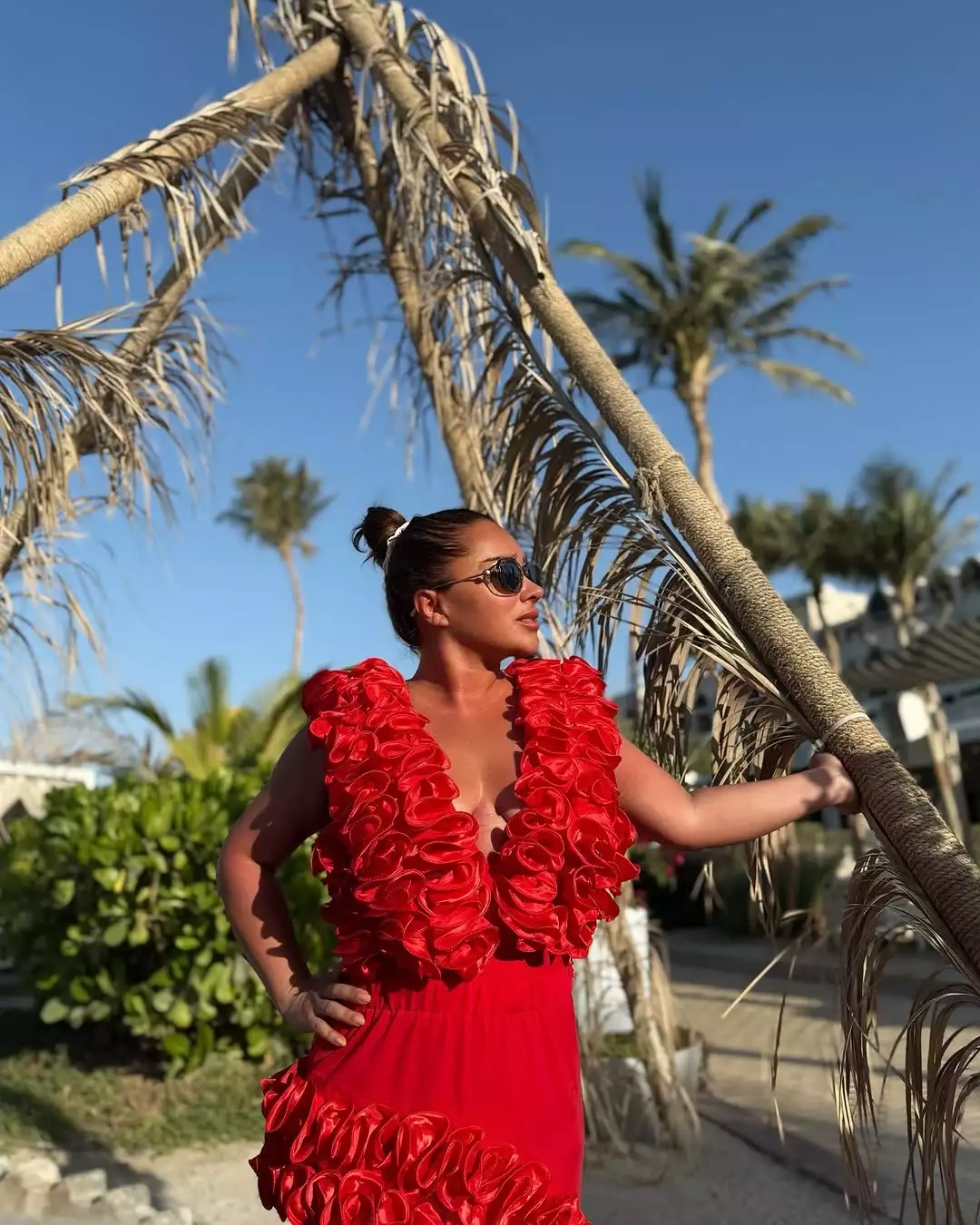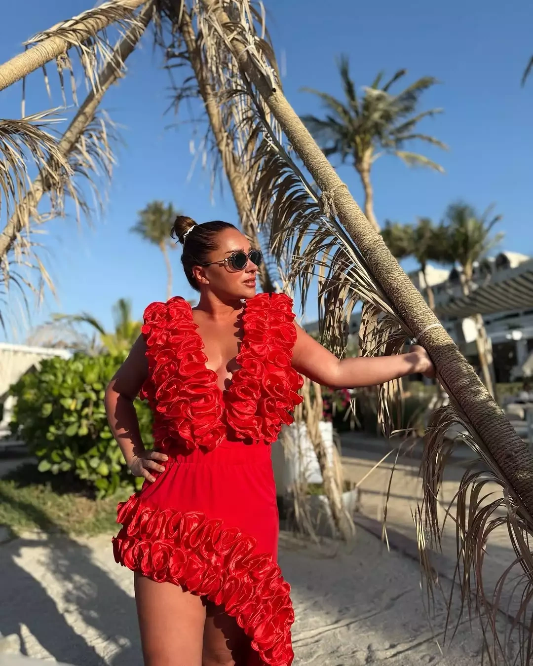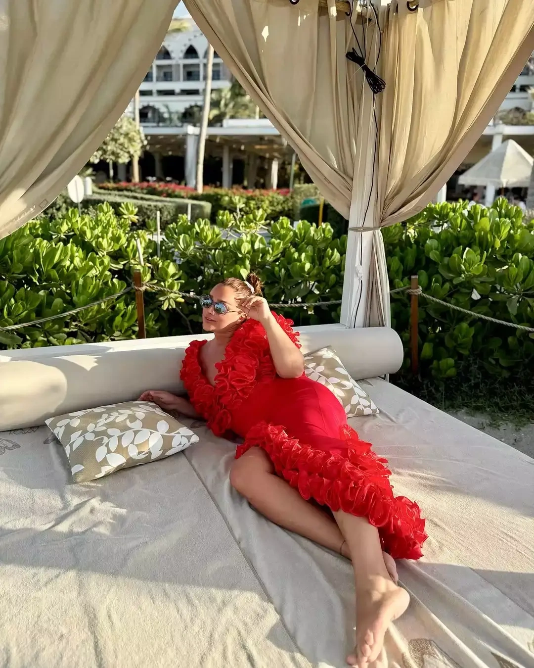 OLAY yazır ki, çimərlikdə istirahətin dadını çıxaran sənətçi qırmızı rəngli yan hissələri açıq, sinə dekolteli libasda obyektiv qarşısına keçib.