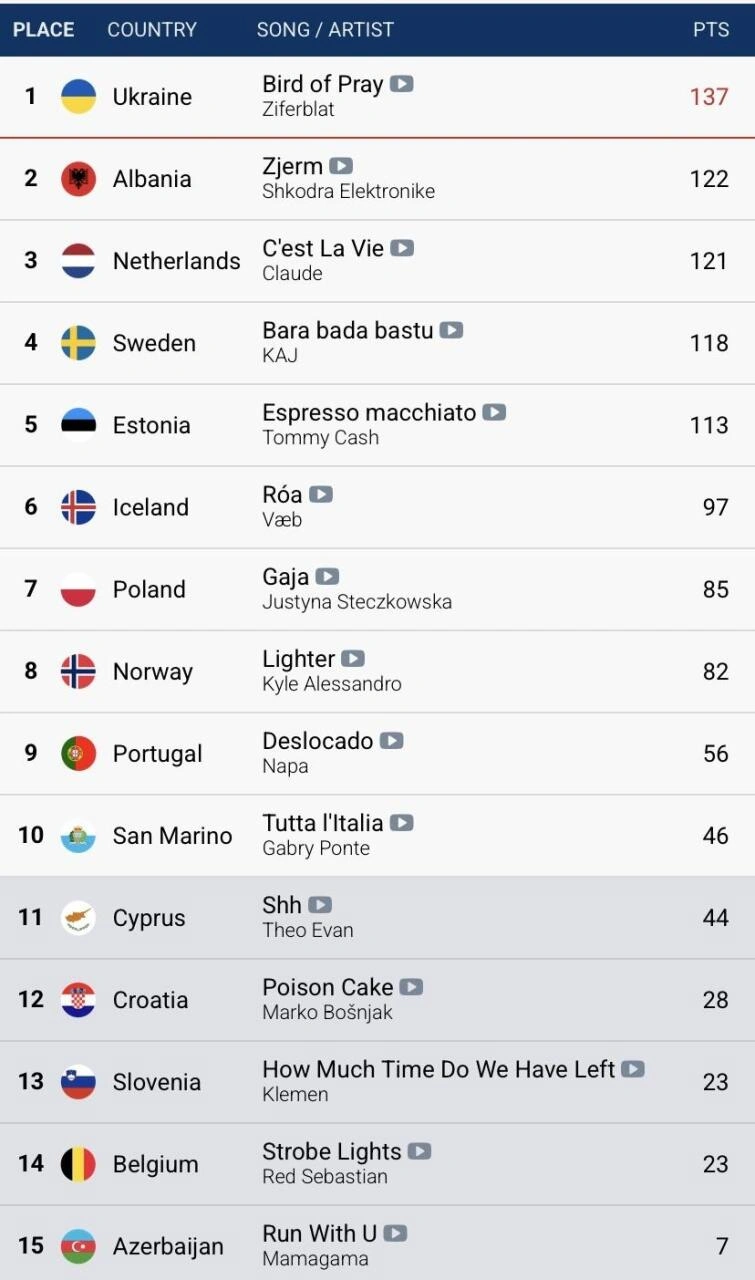Milli.Az xəbər verir ki, ölkəmizə yalnız San-Marino xal verib. Bununla da Azərbaycan həm yarımfinal, həm də ümumi səslərə görə sonuncu olub.