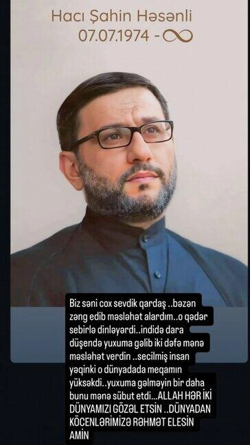 "Biz səni cox sevdik, qardaş. Bəzən zəng edib məsləhət alardım. O qədər səbrlə dinləyərdi ki... İndi də dara düşəndə yuxuma gəlib iki dəfə mənə məsləhət verdin. Seçilmiş insan, yəqin ki, o dünyada da məqamın yüksəkdi. Yuxuma gəlməyin bir daha bunu mənə sübut etdi. Allah hər iki dünyamızı gözəl etsin. Dünyamızdan köçənlərimizə rəhmət eləsin, amin".