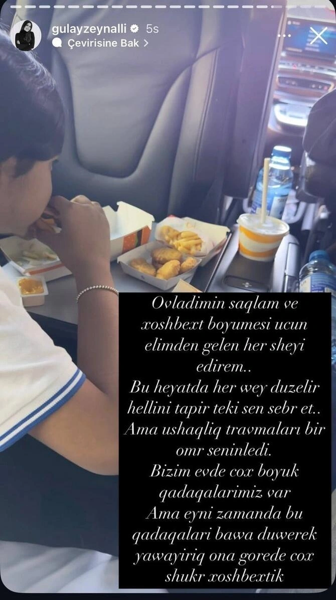 "Övladımın sağlam və xoşbəxt böyüməsi üçün əlimdən gələni edirəm. Bu həyatda hər şey düzəlir, həllini tapır, təki sən səbr et! Amma uşaqlıq travmaları bir ömür səninlədir. Bizim evdə çox böyük qadağalarımız var. Amma eyni zamanda qadağaları başa düşərək yaşayırıq. Ona görə də çox şükür ki, xoşbəxtik!".