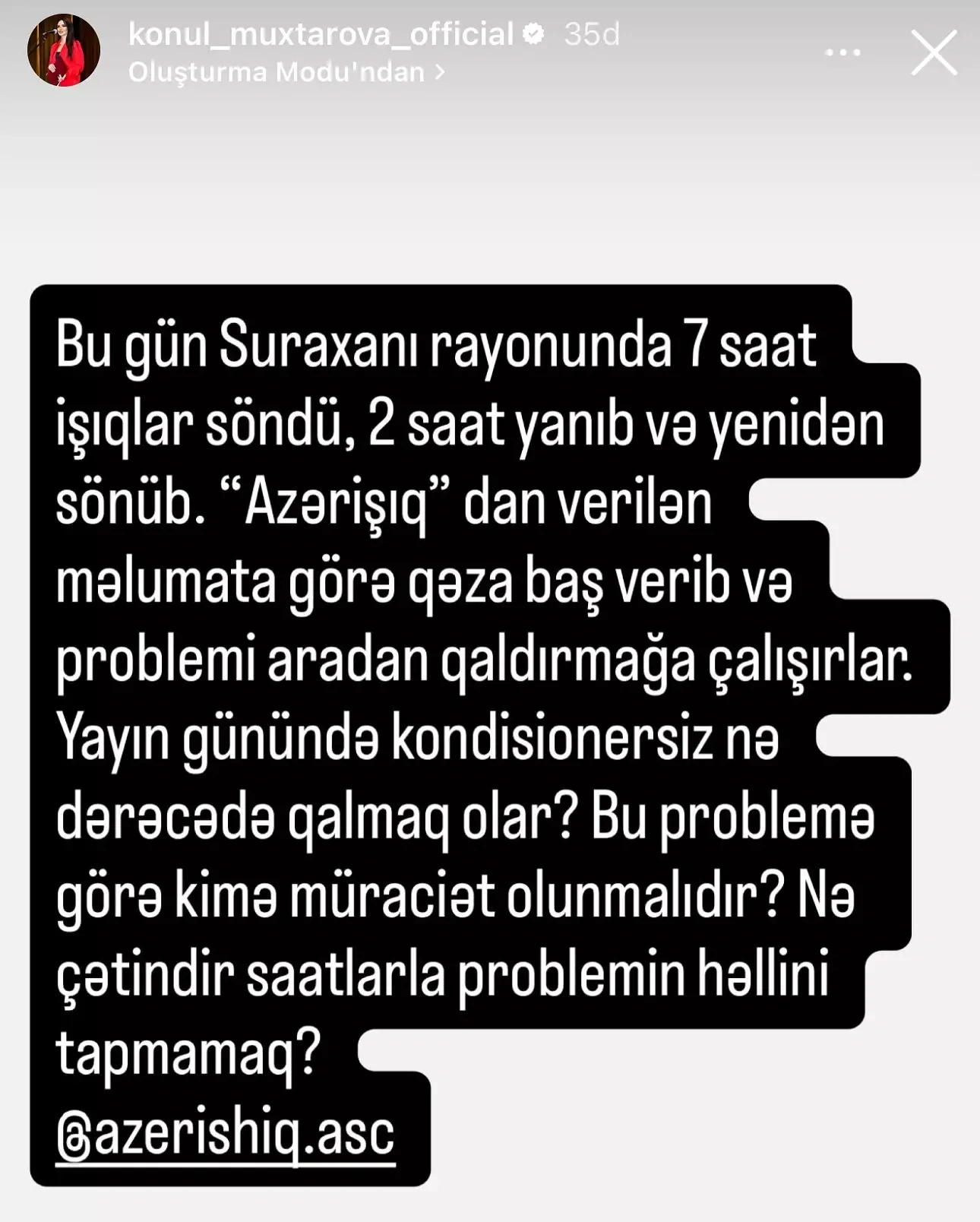 Tanınmış aparıcı Könül Muxtarova bu gün Suraxanı rayonunda yaşanan uzunmüddətli elektrik kəsintisi ilə bağlı sosial şəbəkə hesabında narazılığını ifadə edib.