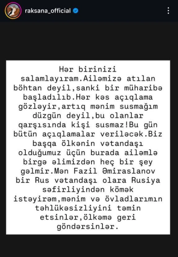 "Hər birinizi salamlayıram. Ailəmizə atılan böhtan deyil, sanki bir müharibə başladılıb. Hər kəs açıqlama gözləyir, artıq mənim susmağım düzgün deyil, bu olanlar qarşısında kişi susmaz! Bu gün bütün açıqlamalar veriləcək. Biz başqa ölkənin vətəndaşı olduğumuz üçün burada ailəmlə birgə əlimizdən heç bir şey gəlmir. Mən Fazil Əmiraslanov bir rus vətəndaşı olaraq Rusiya səfirliyindən kömək istəyirəm. Mənim və övladlarımın təhlükəsizliyini təmin etsinlər, ölkəmə geri göndərsinlər".