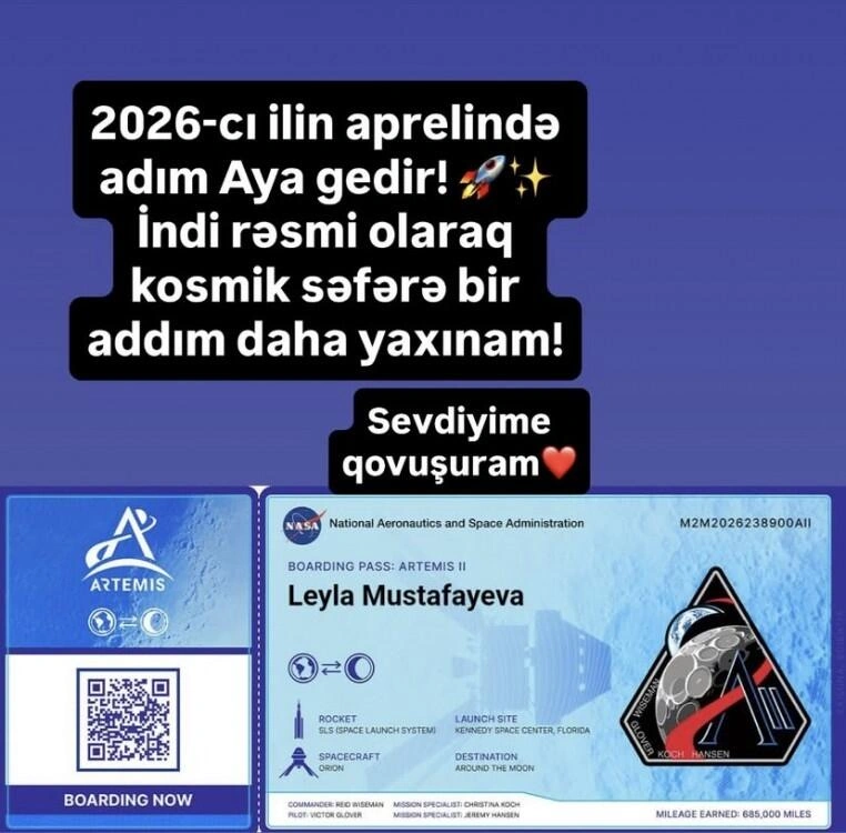 "Qızım və mənim adım xüsusi SD karta yazılacaq və "Orion" uçuş aparatının içində kosmosa göndəriləcək. Bu, Artemis 2, NASA-nın Aya insanlı uçuş planının ilk mərhələsində baş tutacaq. Cismim gedə bilməsə də, ruhum bunu edəcək. İnşallah ki. adımız apreldə kosmosa gedəcək".