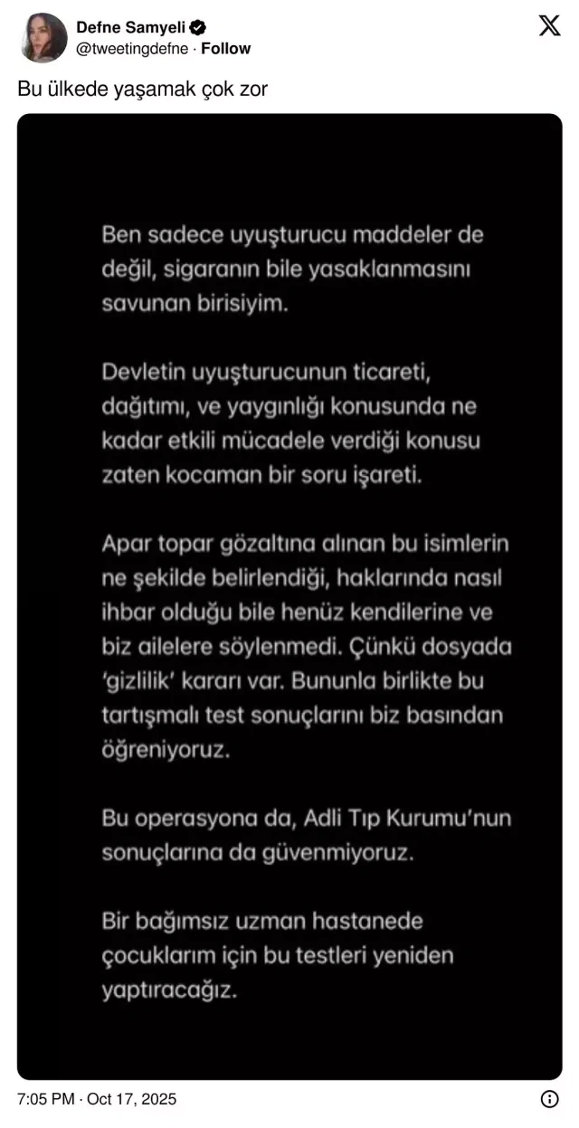 Aktrisa və aparıcı Defne Samyeli qızlarının qanında narkotik maddə tapılmasına sərt reaksiya verib: