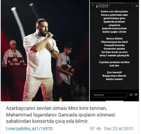 "Instagram" hesabının hekayə bölməsində paylaşım edən sənətçi, konsert zalında çox sayda insanın qaranlıqda qaldığını qeyd edib.