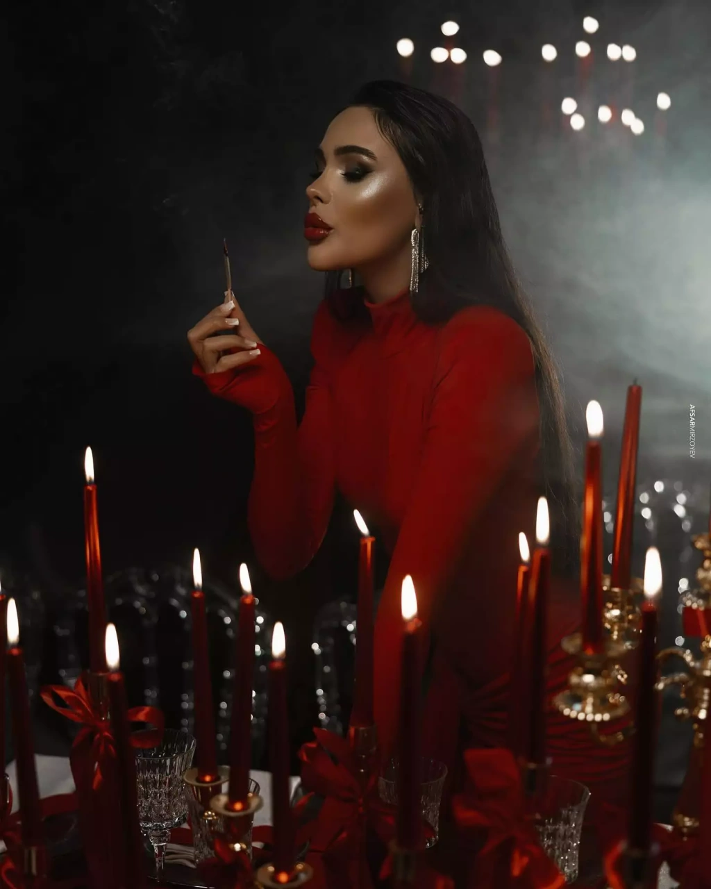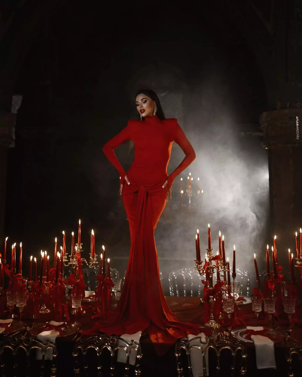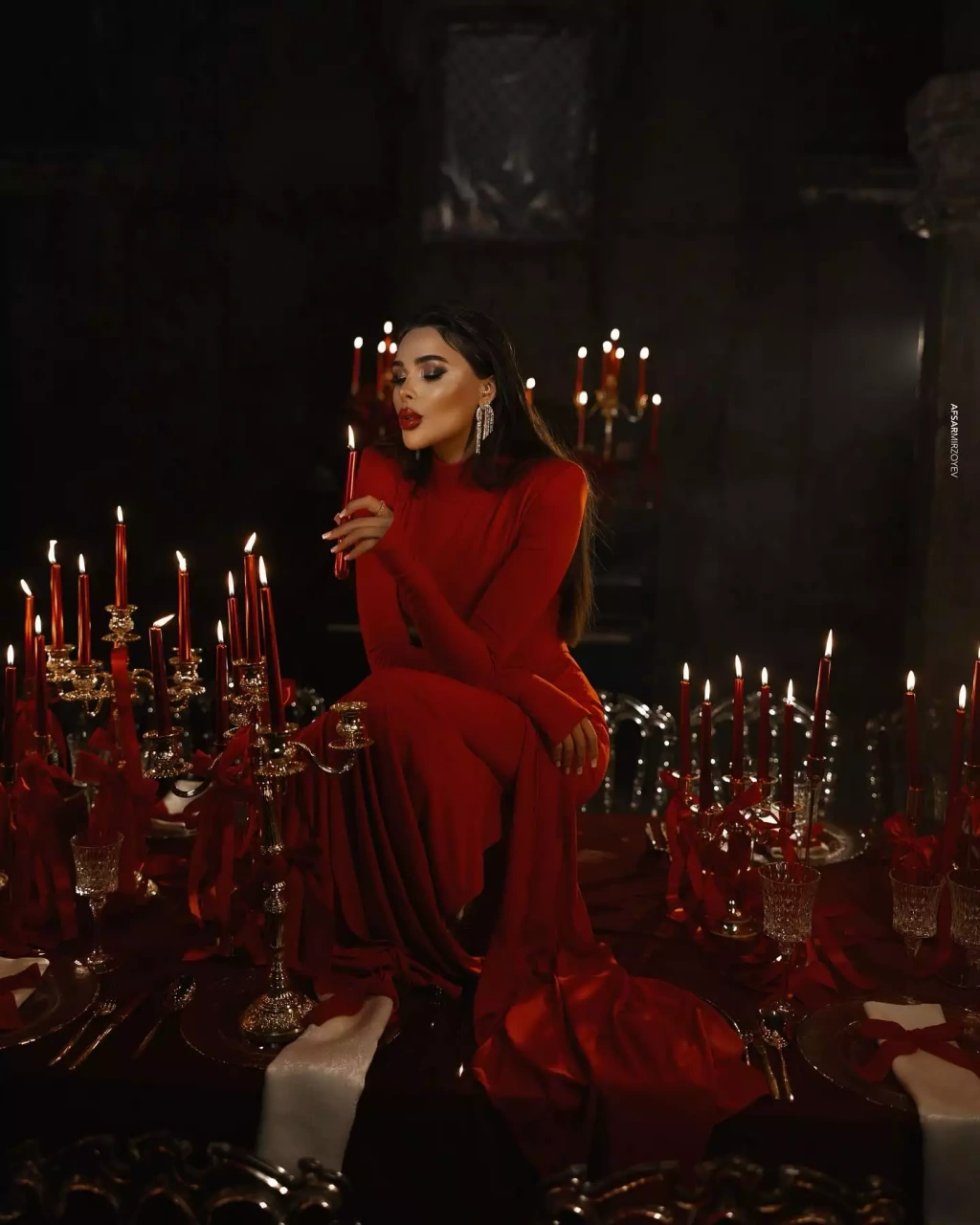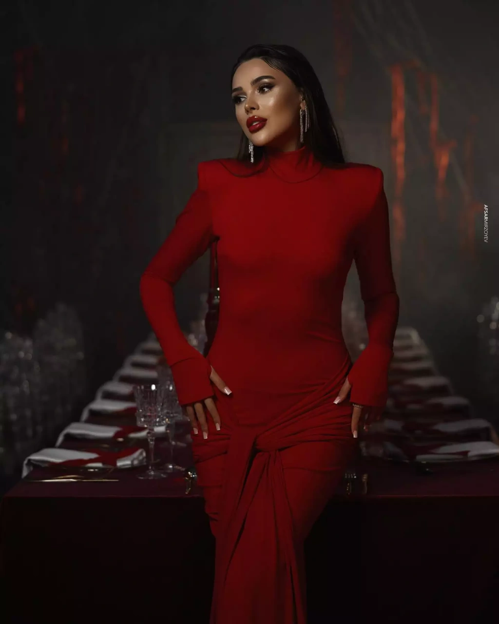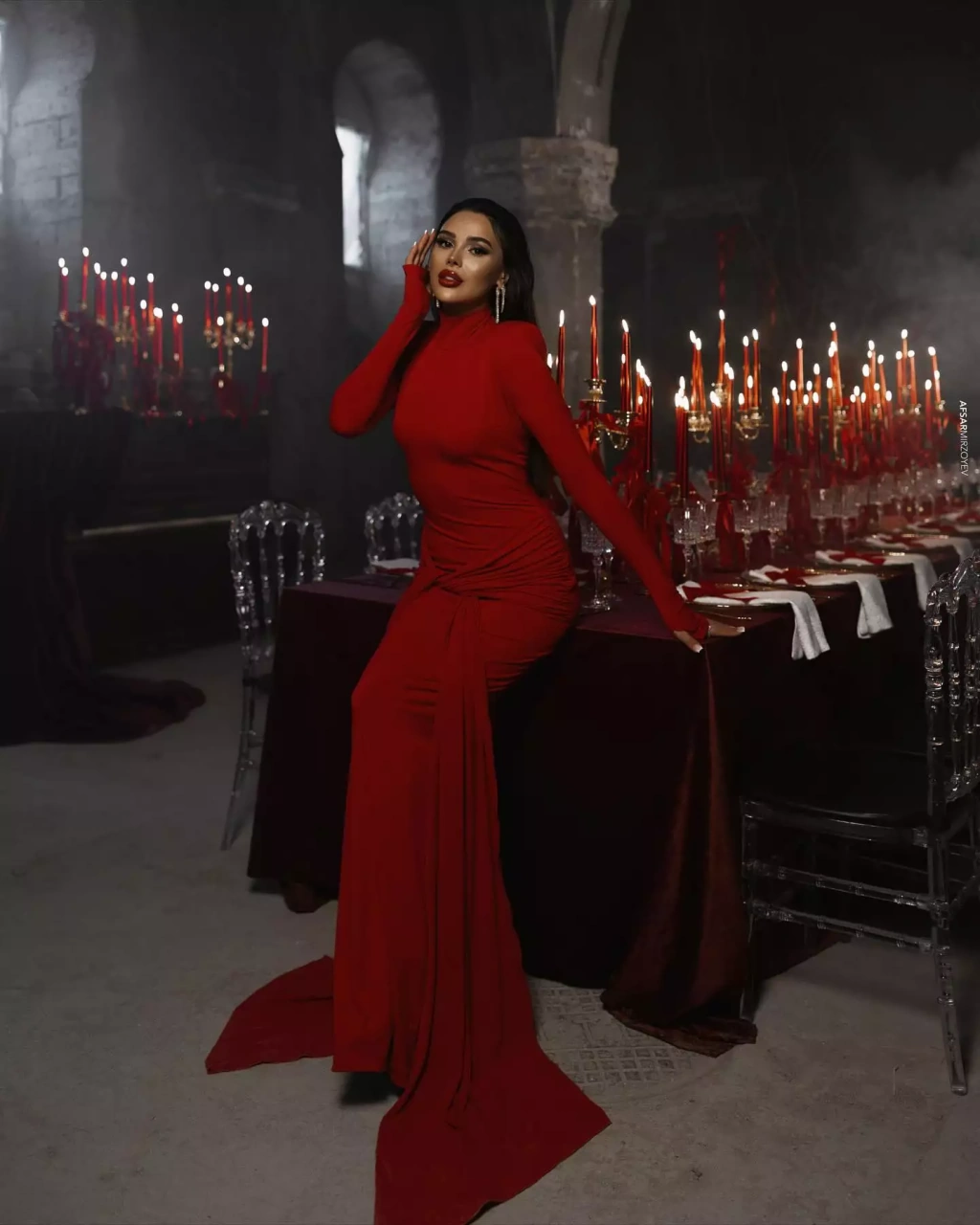 Milli.Az olay-a istinadən xəbər verir ki, bloger qırmızı uzun libası ilə eyni rəngdı aksesuarlara bəzədilmiş məkanda şəkillər çəkdirib.