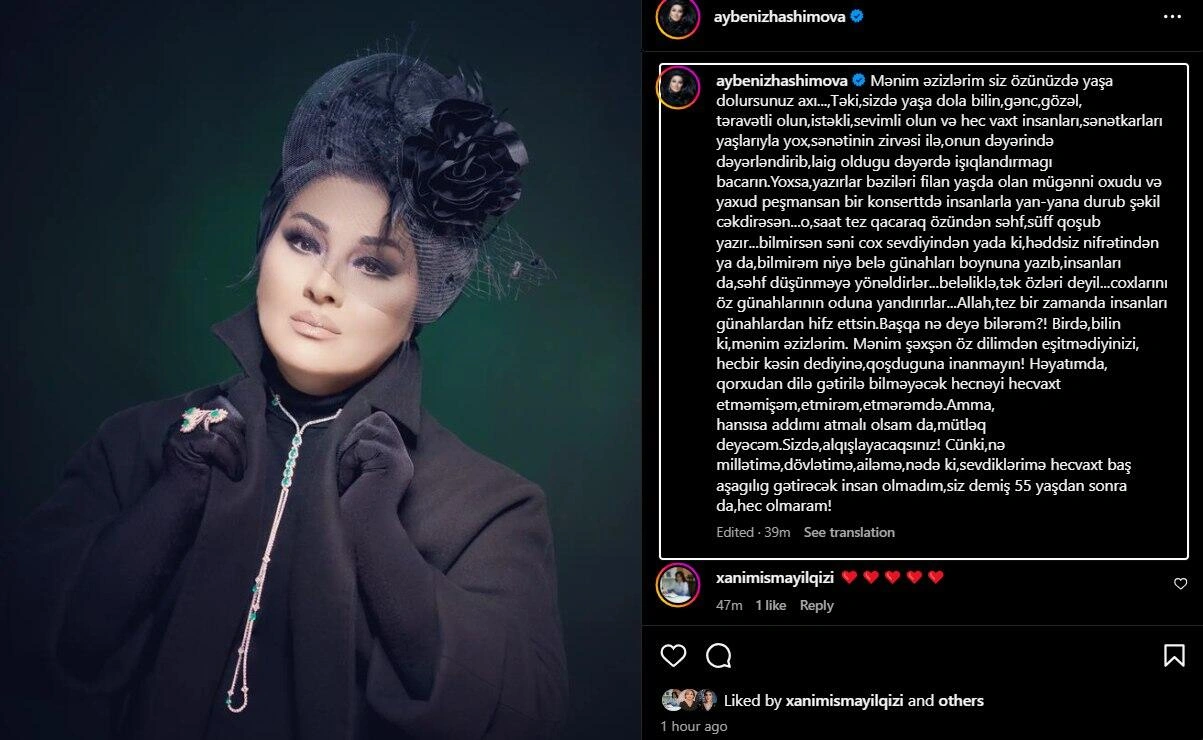 Milli.Az mizim.media-ya istinadən xəbər verir ki, bu sözləri Əməkdar artist Aybəniz Haşımova sosial şəbəkə hesabında paylaşdığı postda yazıb.
