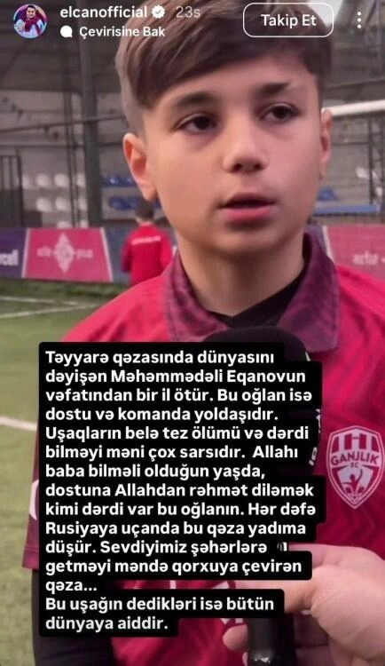 Aktyor Elcan Rəsulov ötən il Aktau yaxınlığında vurulan AZAL təyyarəsinin vurulması nəticəsində həyatını itirən 8-ci sinif şagirdi Yeqanov Məhəmmədəli ilə bağlı paylaşım edib.