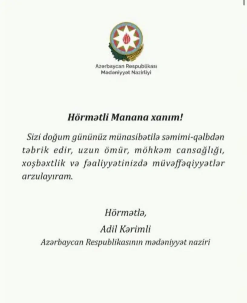 Əsas Şou biznes Nazirlikdən Əməkdar artistə təbrik məktubu Nazirlikdən Əməkdar artistə təbrik məktubu Gülay — 30 Dec 2025 10:50 Nazirlikdən Əməkdar artistə təbrik məktubu Bu gün Əməkdar artist Manana Caparidzenin ad günüdür.OLAY yazır ki, Mədəniyyət Nazirliyi sənətçinin ad gününü təbrik edib.O Nazirliyin göndərdiyi təbrik məktubunu izləyiciləri ilə bölüşüb və Nazirə təşəkkürünü bildirib.