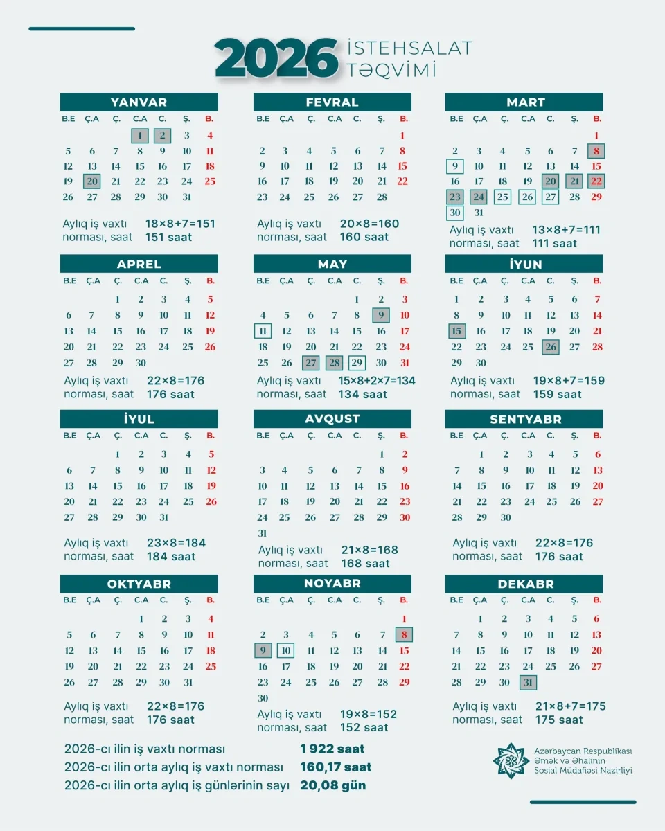 2026-cı ildə illik iş vaxtı norması – 1922 saat